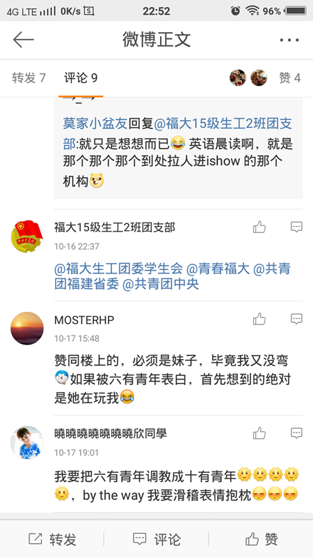 宣传委员在班级微博发表#线上互动,共享“六有”#为话题的前半句,引起同学们的热烈讨论,阅读量评论量也在逐步增加。
