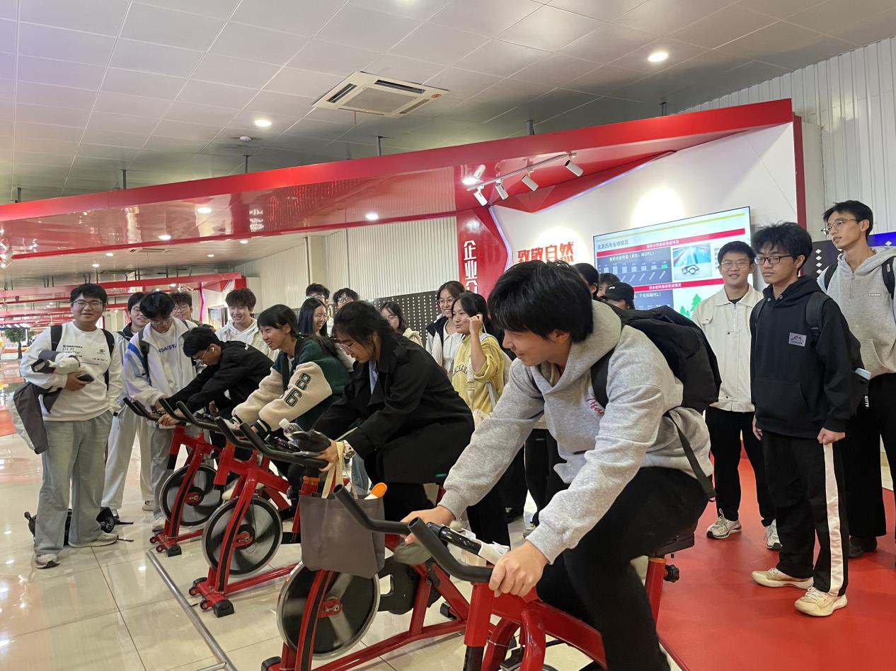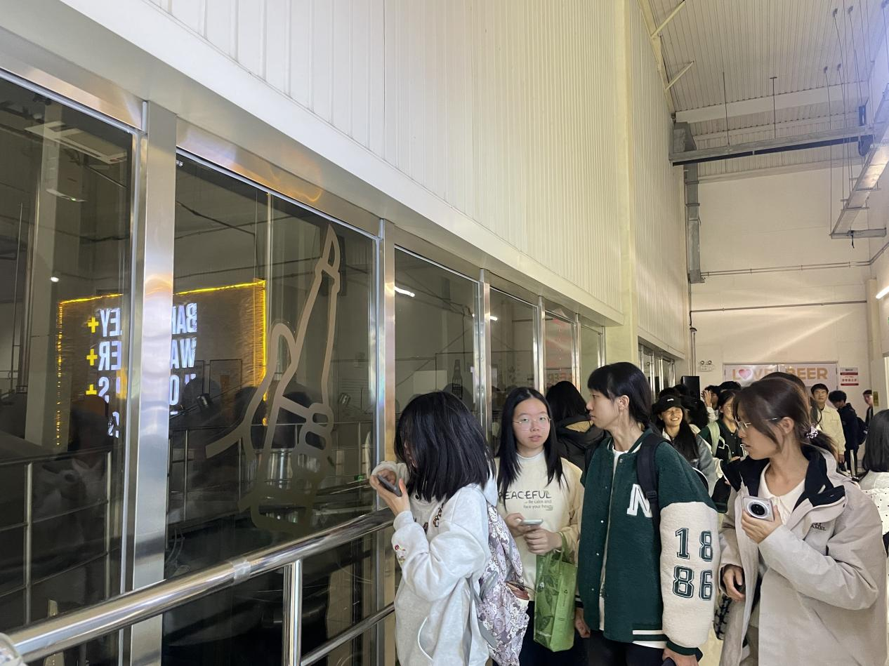 随后,大家深入文化展示区与高度自动化的生产车间,从独具特色的“企业党建”文化墙到全球化战略布局,从零纯啤酒等创新产品的研发理念到趣味盎然的碳中和互动体验区——同学们通过骑行收集“碳中和能量”,在轻松氛围中践悟大型企业在可持续发展方面的实践与担当。应急纯净水、援建希望小学等案例,生动展现了企业的社会责任感。最令同学们震撼的是目睹从原料处理、糖化、发酵到灌装的全流程智能化生产线,高效运转的精密设备让书本上的“食品工程原理”、“食品工厂设计”等课程内容变得清晰可触。