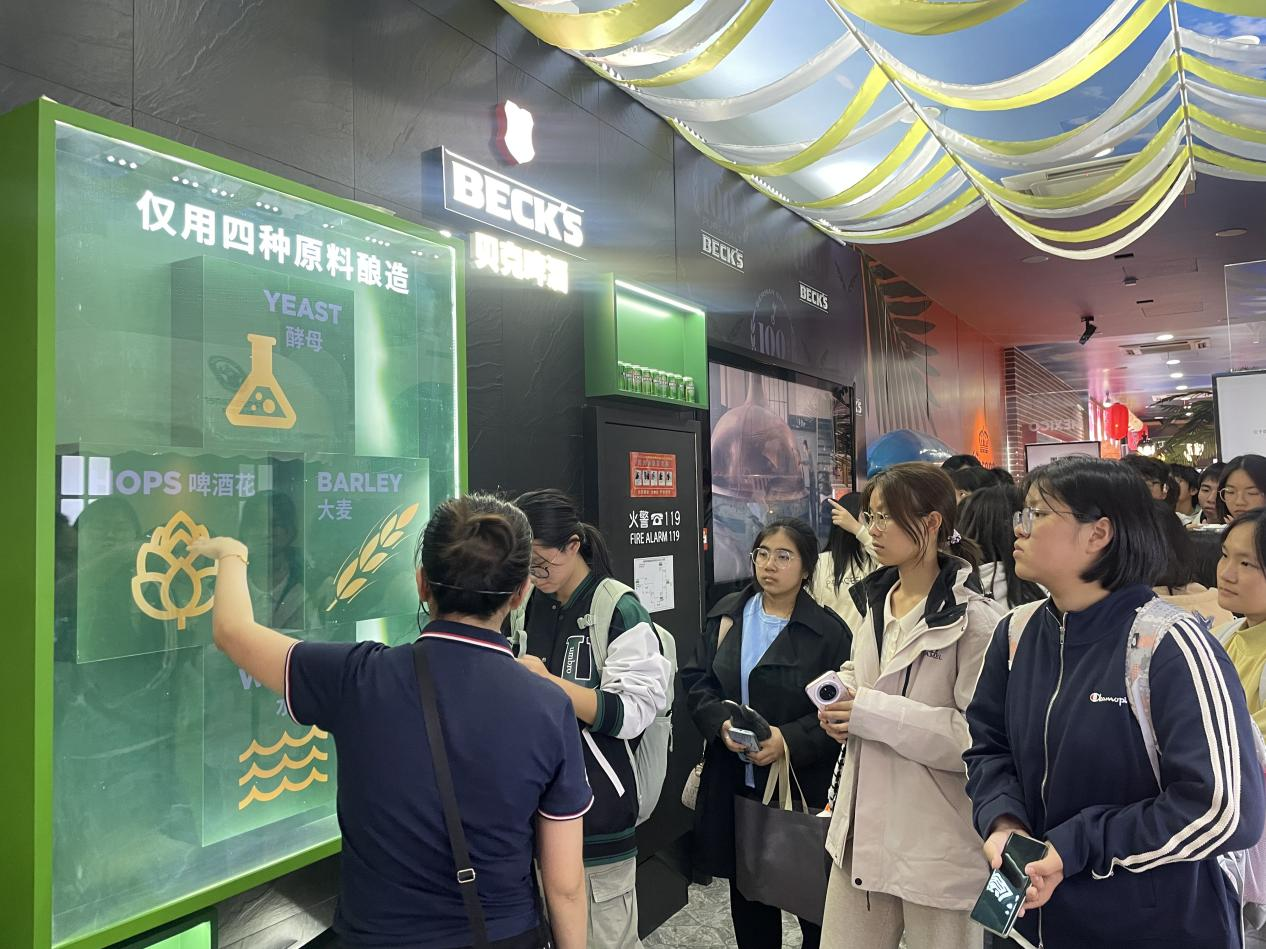 (欧冠直播师生在讲解员的介绍下认识百威雪津啤酒有限公司旗下各类产品)