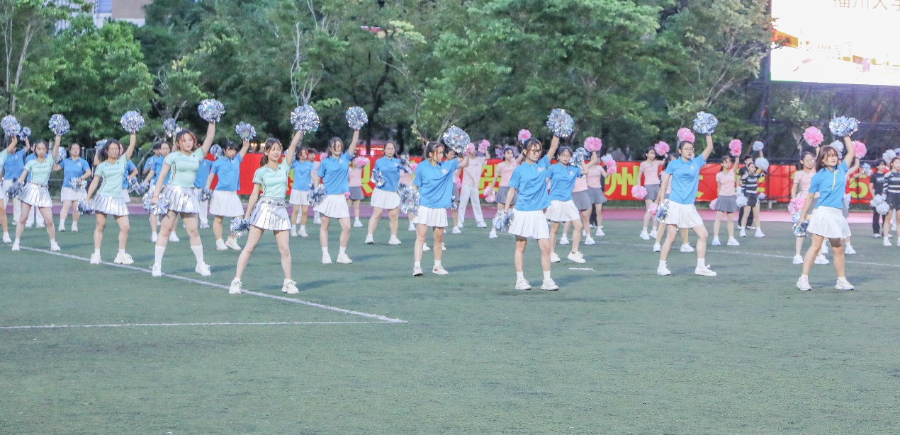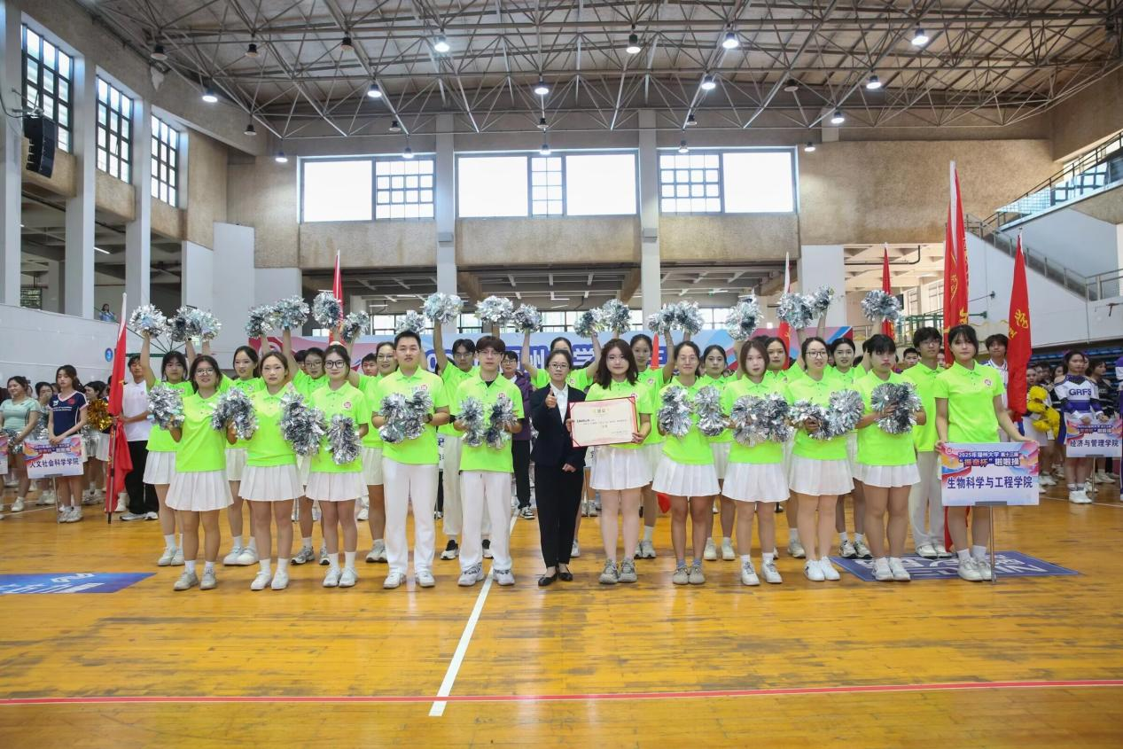 “Get Ready Go!”动感旋律一响起,队员们便切换至最佳状态。荧光绿色上衣搭配白色裙摆,亮眼配色既呼应生工学子探索未知的热忱,又尽显蓬勃朝气。花球挥舞划出灵动弧线,起落间满是活力;转身、托举、踢腿一气呵成,动作整齐划一,每一个节拍都踩得精准有力。队员们眼神坚定,笑容灿烂,将训练中扎实功底与团队默契配合展现得淋漓尽致,用热情与活力感染着现场所有人,成为赛场上一道亮丽的风景线。本次比赛成绩,既是对队员们辛勤付出的认可,更彰显了“精益求精、敢拼敢赢”的良好风貌!